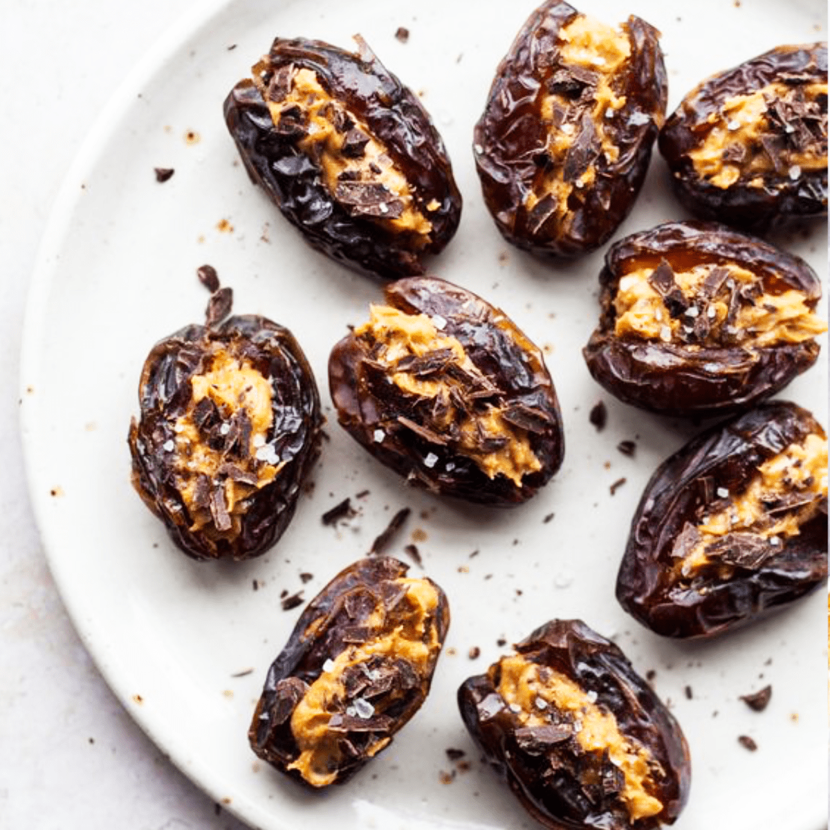 Garnissez vos dattes de beurre de cacahuète et saupoudrer les de copeaux de chocolat.