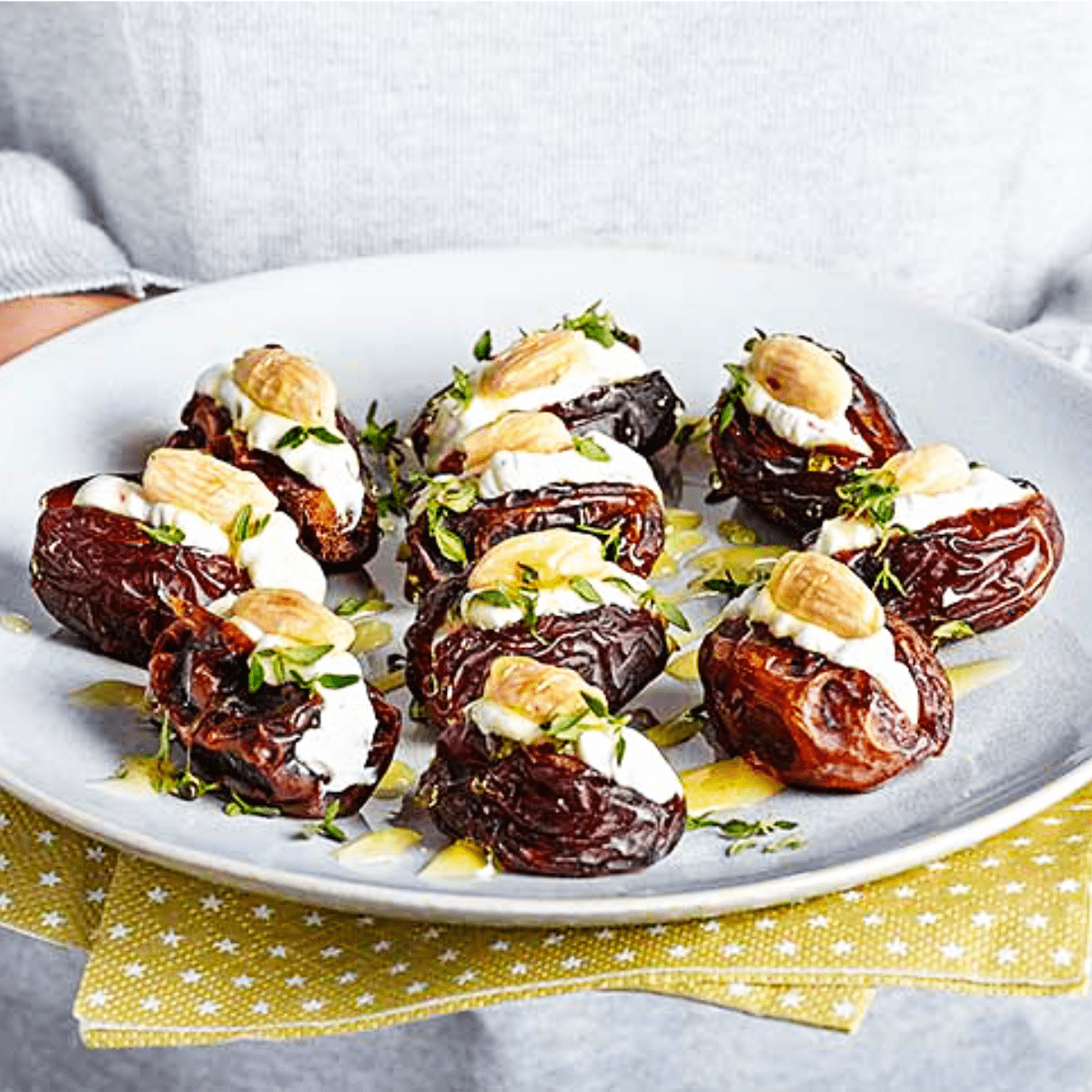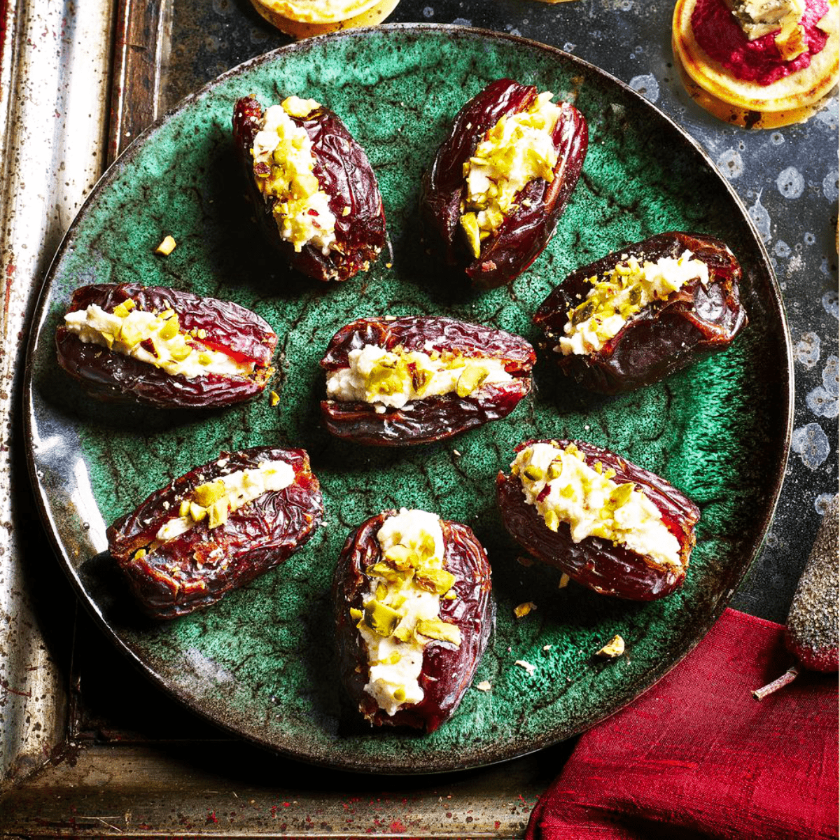 Garnissez vos dattes de fromage de chèvre et saupoudrer les de pistaches broyées.